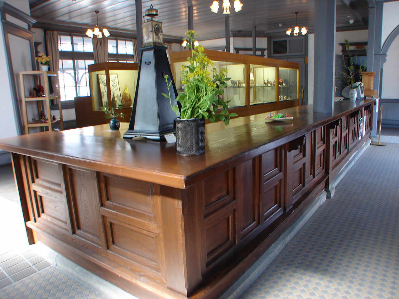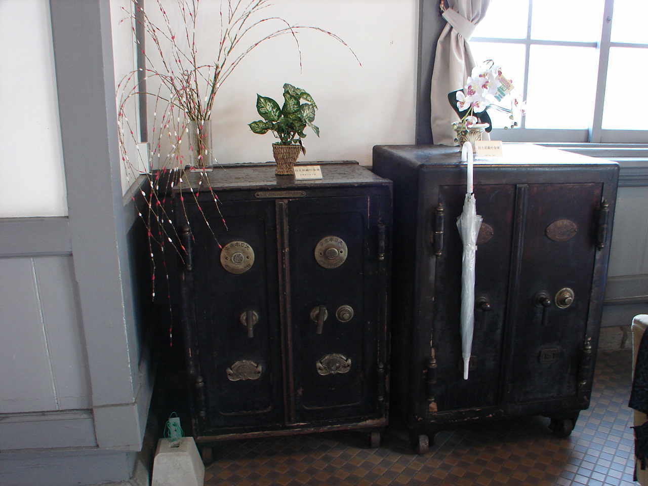 1階内部カウンターの腰壁の桝形の意匠と、写真右は当時の金庫