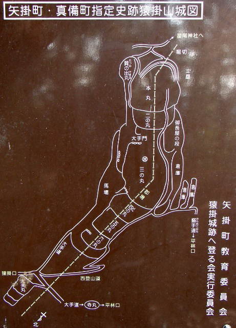 【沿革】猿掛城は真備町妹と矢掛町横谷にまたがる中世以来の山城である。猿掛城築城のはじまりは東国の武将・庄太郎家長がこの地に地頭として赴任した際に当初、幸山城(総社市所在)へ入ったが、防禦に不便として元久2年(1205年)ごろ猿掛山へ新城を築いて移ったことによる。猿掛城は庄氏が366年間にわたり備中支配の拠点として利用した後、天正3年(1575年)に毛利元清が5千貫の領主として入城した。また、この城は天正10年(1582年)の高松城水攻めの際に毛利輝元の本陣となったことでも有名である。関ヶ原の戦いで西軍が敗れたことにより、元清のあとを継承した毛利秀元が長府へ帰った後、慶長9年(1604年)、猿掛城に花房志摩守正成が5千石で入城したが、元和元年(1615年)の一国一城令で廃城となり、元久以来の名城も410年間で終局を迎えたといわれている。(文は一の丸(本丸)に設置の現地説明板より) |