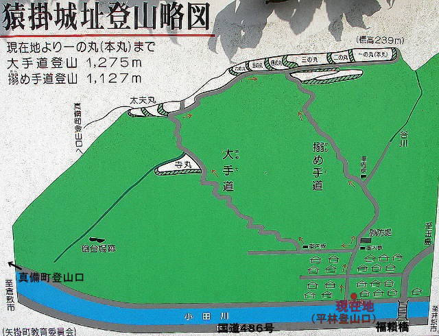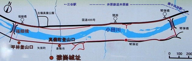 ■国道486号から福頼橋を渡り左(東)に折れ、川沿いに少し行くと平林登山口が右手にあり、此処から大手道を登り訪城(2013年2月)。真備町側にも登山口がある(地図は現地説明板に一部加筆の上、転載)