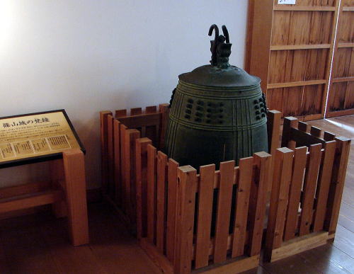 ![]() 篠山城の梵鐘 この梵鐘は、4代藩主松平(形原)康信が、寛文12年(1672)に二世安楽を願って造り、城中の道場にかけていたものです。その後、京都の新熊野権現社や蓮華寺へと移され、大切に保管されていました。 昭和58年(1983)、多くの方々の尽力によって310年ぶりに篠山へ還ってきました。大書院が復元されたのを機に、この場所で展示することにしました。 |