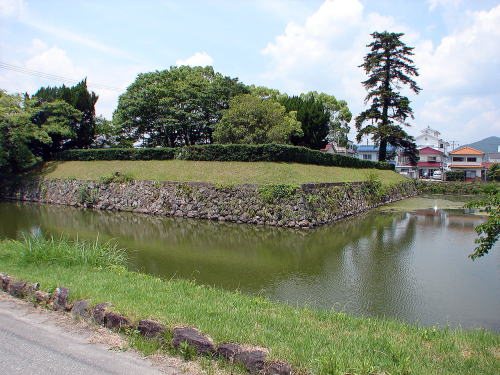 ![]() 本丸石垣(南面)と内堀 本丸石垣上には、隅櫓と多聞櫓が連結して本丸を取り囲んでいた。右端の石垣が天守台。 |