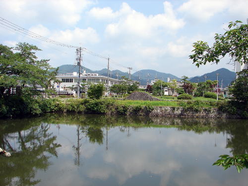 ![]() 広大な外堀 左写真の土橋から写した北外堀。外堀左側には現在、篠山市役所が建ち、右側は三の丸跡。 |
