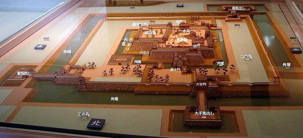 《徳川家康の命によって、西国の諸大名が動員されて築かれた「天下普請」の城》![]() 三の丸跡(北側)から望む二の丸・本丸を囲む石垣と大書院。周囲には内堀が廻る <正面入口から大書院まで、廊下門・表門・中門・鉄(くろがね)門と枡形虎口が続く> |