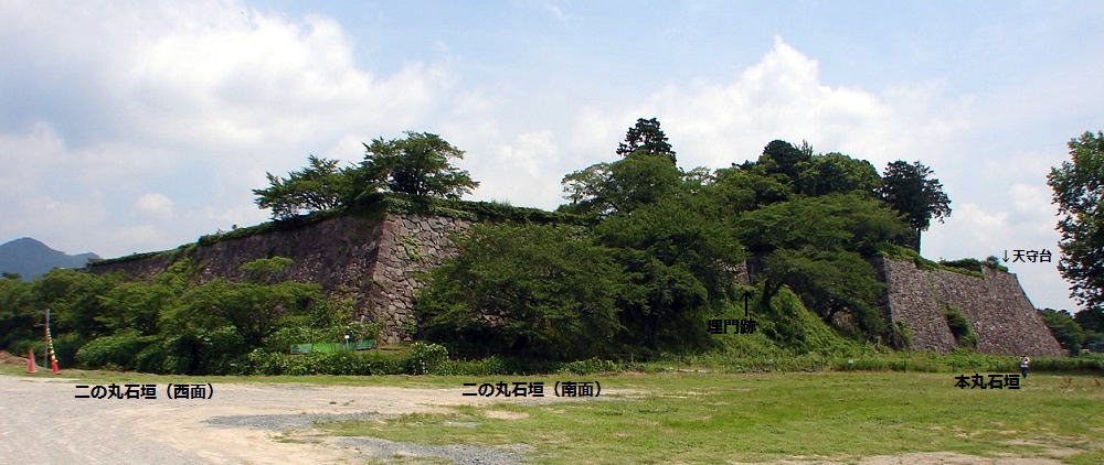 【三の丸(南側)から望む二の丸、本丸を囲む石垣】 左より二の丸石垣西面・南面、二の丸石垣(南面)と本丸石垣の中央に二ノ丸埋門跡、右端は本丸石垣と天守台 |