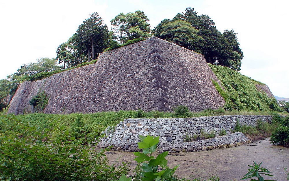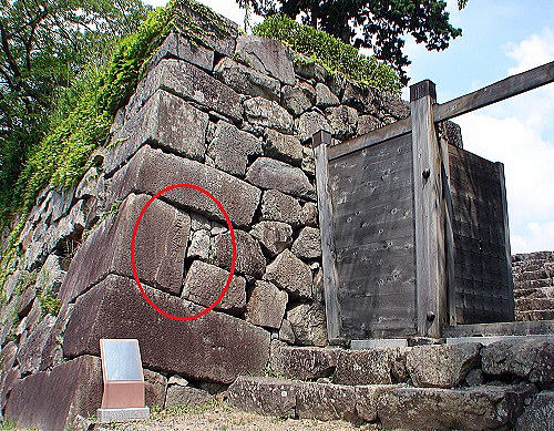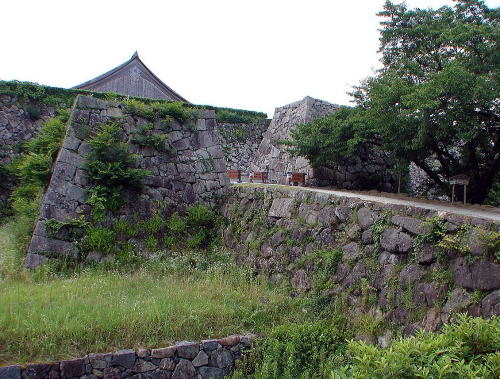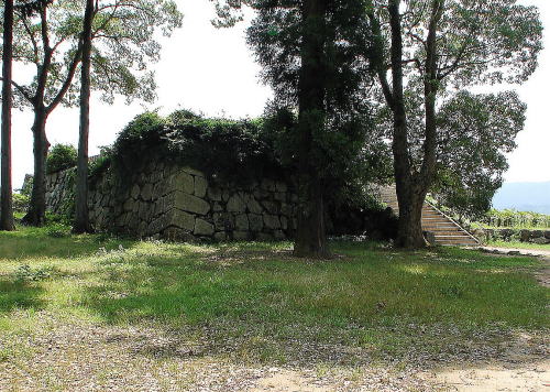 ![]() 天守台石垣(本丸内側) 天守閣は築城時に、江戸幕府の指示により、城郭が堅固すぎるとの理由で建築が中止され、代わって天守台南東隅に二間四方(4m四方)の1重の隅櫓が建てられた。 |