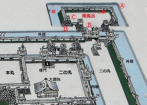 下図Ⓐ地点より望む南馬出と南馬出堀土塁造の馬出である。 【馬出】 城の出入口を虎口といい、攻城戦の最前線となるため、強力に虎口の外側を守る必要から工夫された防御構造の一つが「馬出」という施設。 虎口の前面、堀に架かる橋の外側に、防御・出撃の拠点となる堀と土塁で区画されたもの。もともとは、この内側に騎馬武者がそろって、打って出たことからこの名がついたともいわれる。馬出の形には、平面が長方形の角馬出し(篠山城は角馬出)と、平面が半円形の丸馬出の2種類がある。明治の廃城によって、馬出は交通の障害になるのでほとんどの城で取り除かれた。 |