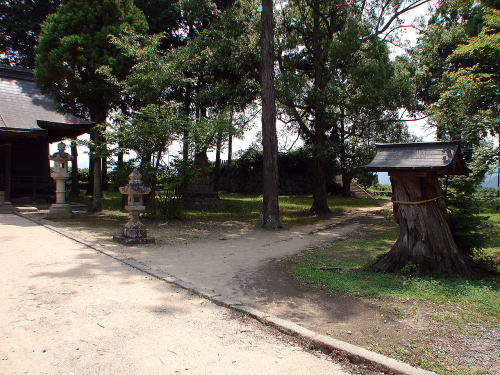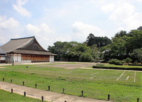 ![]() 大書院と二の丸御殿跡 御殿跡は、平坦部に平面表示の工法で、平成14年(2002)に完成。樹木部分は本丸跡。 |