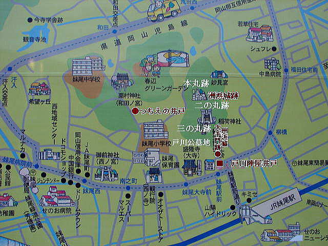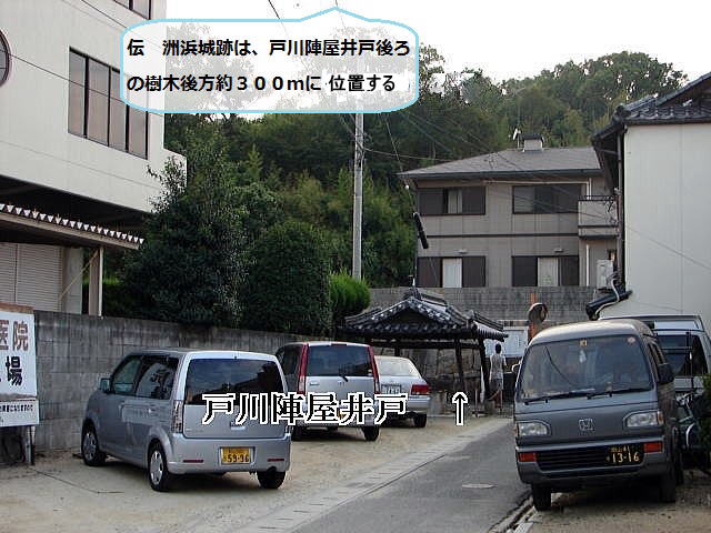 ※江戸時代に、戸川氏の陣屋が置かれた洲浜城は、平家の武将妹尾太郎兼康(妹尾兼康。備中国都宇郡妹尾郷、現在の岡山市南区妹尾付近を本拠とした武士)によって、平家の全盛の頃に構築されたとされ、戸川陣屋井戸のすぐ北側が洲浜城の大手門があった所と伝えられている。この大手門の場所から小高い丘陵地帯となっており、頂上に向って三の丸・二の丸・本丸と続いていたようです。現在では、城跡さらに陣屋跡さえも破壊されてしまい、遺構として『戸川陣屋井戸』と、笠岡小学校(笠岡市)にある移築された『小田県庁門(戸川氏陣屋門)』が残るだけとなっている。