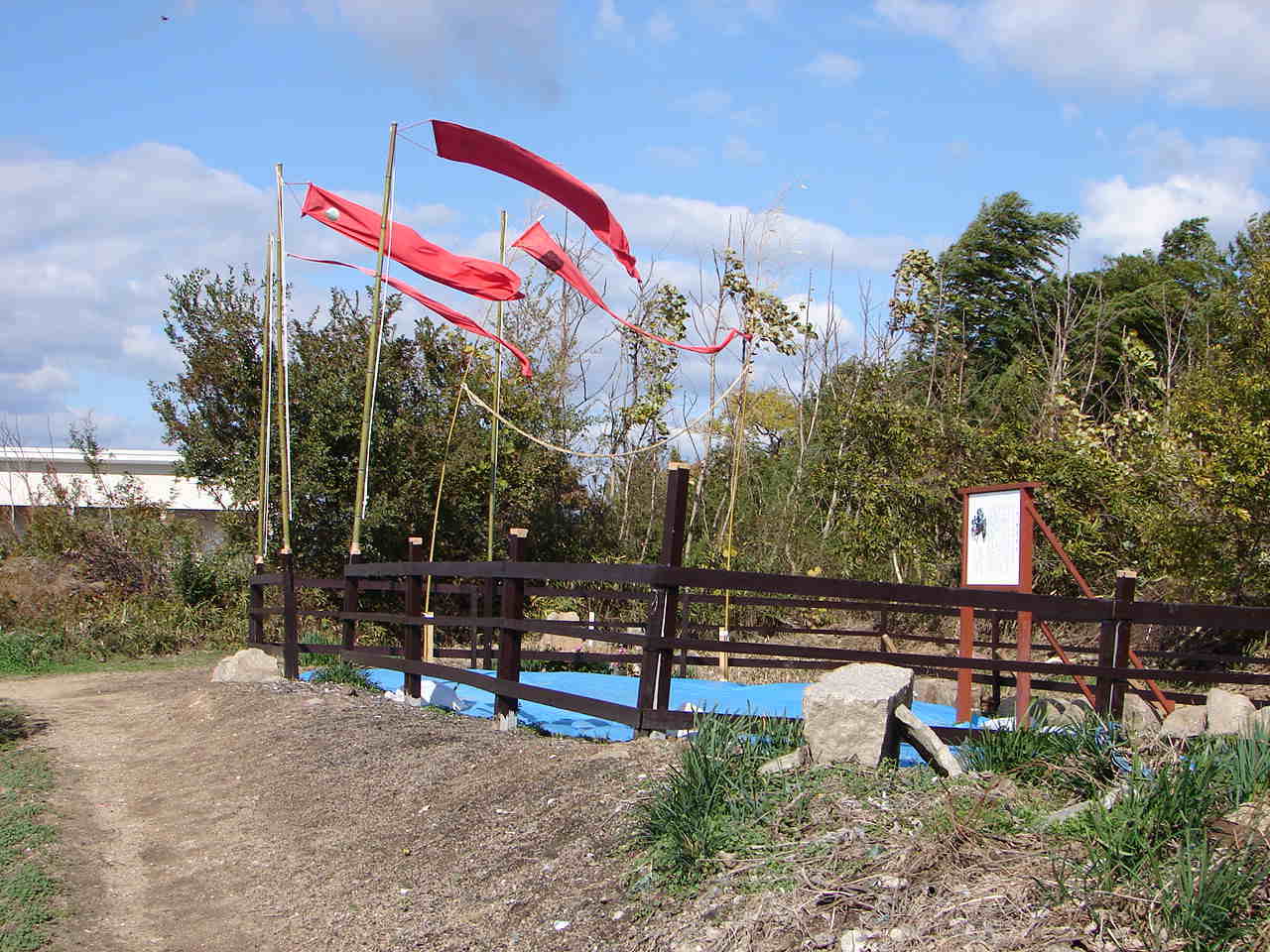 写真は、郷土史研究グループ「妹尾を語る会」が、兼康を偲ぶことのできる場所を設けようと、この場所を居城跡と見立て、整備した。縦約6メートル、横約10メートルの柵や、旗、説明板などを設置。2012年10月14日に、「妹尾太郎兼康伝洲浜城趾完成記念式」が行われた。