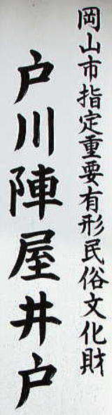 この井戸は、妹尾の旧領主(戸川氏)の陣屋にあった井戸。明治になり陣屋が廃止された後も飲料水の不足に悩む土地の人々が利用してきたもので、当時の形態をよく伝えている。妹尾の土地柄を知る文化財として、昭和四十七年三月二十四日、岡山市指定有形民族文化財に指定された。この井戸の後方に、洲浜城の大手門があったと伝わる。