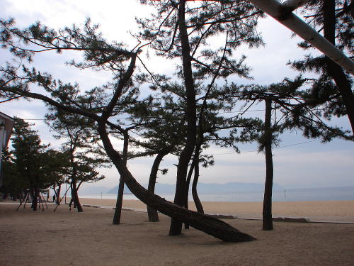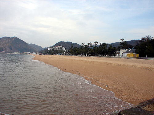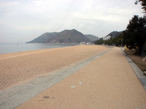 ![]() 遊歩道(水叩兼用。セラミック舗装)と砂浜(養浜) 前方は王子が岳、その右は瀬戸内国際マリンホテル |