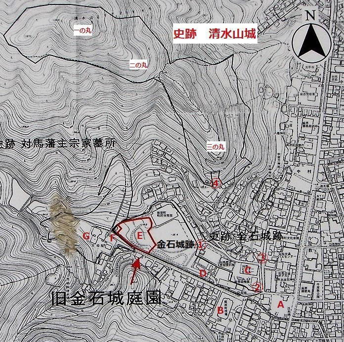 | A=観光情報館ふれあい処つしま(厳原港から徒歩約15分。城パンフレット入手) B=対馬市役所 C=対馬博物館(仮称) D=金石城櫓門 E=旧金石城庭園「心字池」 F=金石城搦手門 G=万松院 @ABCは清水山城への登山口。@は金石城内からの登山口で案内標識が立っています。ABは下の左写真です。Cは下の右写真です。 |