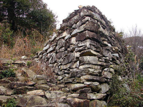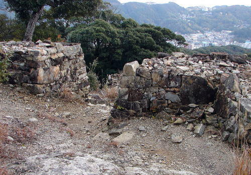 ![]() 織豊系城郭の特徴が見られる石垣。各曲輪で石積みの様式が異なるのも、清水山城の特徴 |