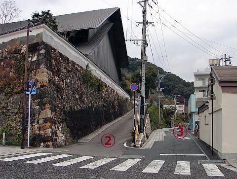 ![]() Aは対馬博物館(仮称)横の坂道を登って行く登山口。石垣上に建つ新しい対馬博物館は、2019年12月18日現在、開館準備中でした。なお、この場所は金石城東端部になります。Bは坂道右側の道を少し進んだ所にある鳥居をくぐって行く登山口。 |