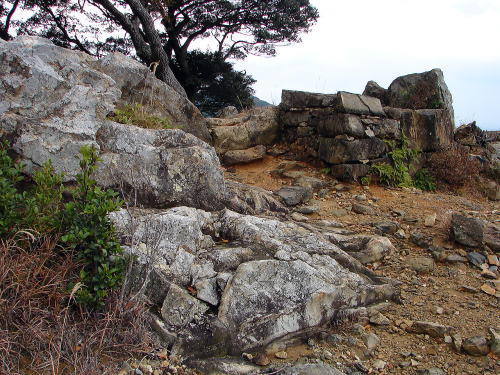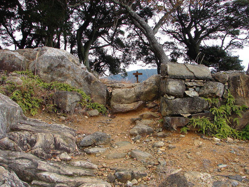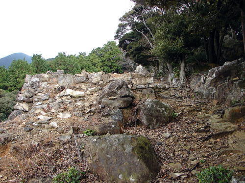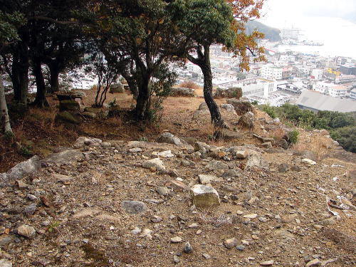 | 史跡 清水山城跡 清水山城跡は、有明山(558.2m)から延びた東の支脈先端にあたる清水山の尾根上に立地する、16世紀末の文禄・慶長の役に際して築かれた城である。 天正期、豊臣秀吉が朝鮮半島の釜山に兵を送るために、本営とした肥前名護屋城から海を渡った後の中継地として、壱岐の勝本城とともに築いたと考えられる。イエズス会宣教師のルイス・フロイスは著書「日本史」で、これに関し、秀吉は壱岐と対馬に「屋敷と宿舎、食糧用貯蔵庫」の建築を命じたと記している。しかし、その構造を見る限り、いわゆる御座所の機能は清水山城ではなく金石城に担わされていた可能性がある。秀吉の築城指令を記す史料は確認されていないが、例えば文化6(1809)年に編纂された「津島紀事」では、秀吉の命により毛利高政が築城したと書かれている。なお、築城者については、近代に出された、対馬領主の宗義智が主力になり、相良長毎、高橋直次、筑紫廣門らが加勢したとする説が有力である。 城は一の丸、二の丸、三の丸と呼ばれる3つの曲輪からなり、延長は約500mである。標高208mの山頂部から南東の標高95mまでの高低差のある地形に位置する。各曲輪は尾根筋の平坦部に石垣を築いて造られており、尾根沿いの石塁でつながっている。尾根は岩盤が露出した狭隘な地形のため、曲輪をつなぐ石塁も10m程の狭い幅で囲われた回廊状になっている。 朝鮮半島に築かれた倭城には、退路の確保などを目的として設けられた港湾から城までを囲う竪石垣と呼ばれる構造があるが、清水山城跡の石塁も曲輪をつなぎ、囲うことで、城内部の防御機能を意識したのであろう(案内板より転載)。 |
