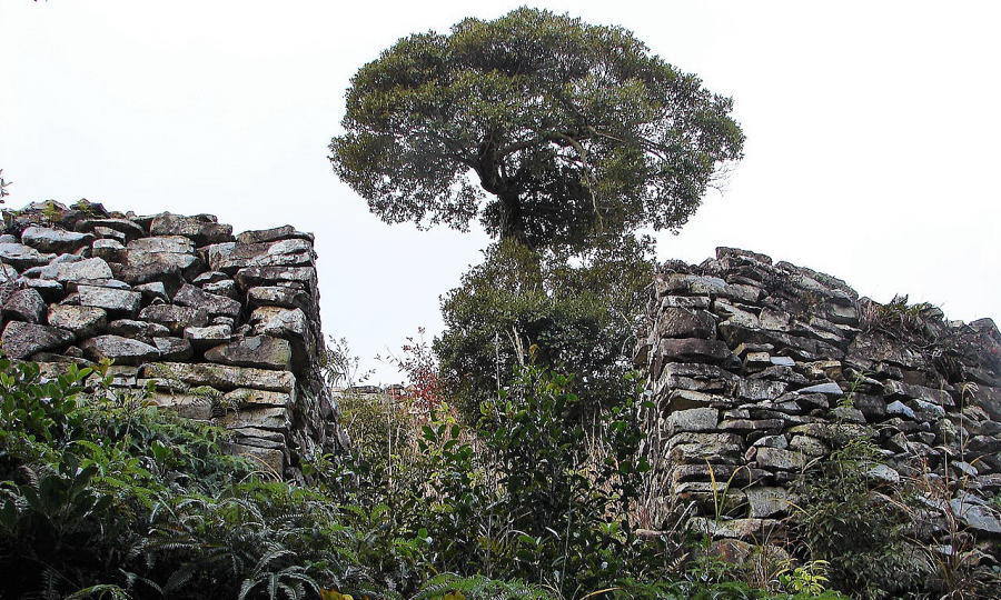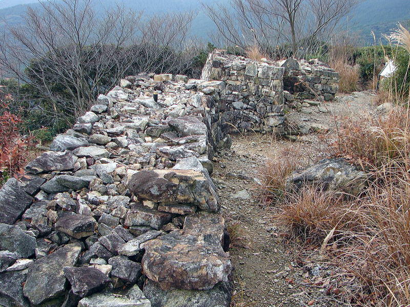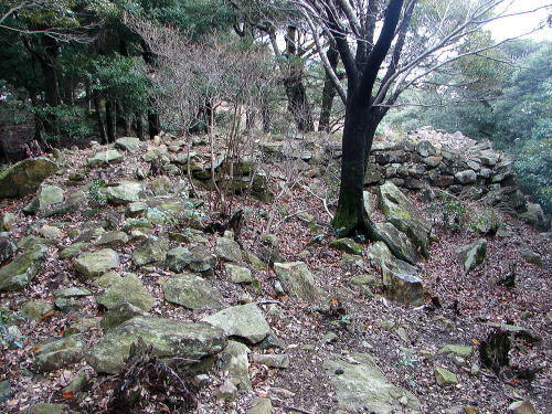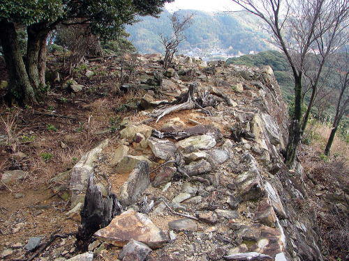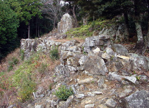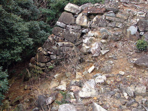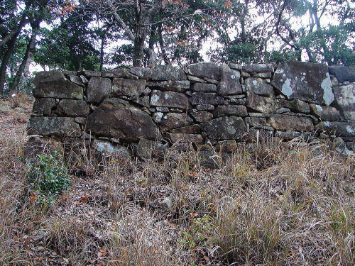 ![]() 尾根の南辺肩部に築かれた石垣 |