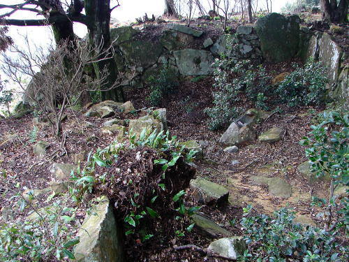 | 清水山城跡 三の丸 清水山城跡の東端に位置する。標高95〜105mの尾根の両肩部に石垣を築き、尾根に沿って細長い形状の曲輪を構成する。東西約80m、南北約30mである。曲輪の石垣は直線で構成され曲面は見られないが、長辺が10〜20m間隔で緩やかに折れて繋がっているため、一見すると長楕円形を呈する。 北辺はやや不明瞭だが南辺は比較的良好に遺存する。隅角部は算木積みの様相を呈し、築石部は扁平な割石を多く用いて、一部だけに横の目地が通る布積みと大小の石を多方向に積んだ乱積みと呼ばれる積み方で構築され、他の石材よりも数倍大きな石を随所に配置する鏡積み様の技法も見られる。 東部南側に虎口が開き、石段が残る。曲輪の累線上には六カ所の横矢枡形がある。三の丸の南端から下には、尾根の稜線沿いに等高線に直交して竪堀がある(案内板より転載)。 |