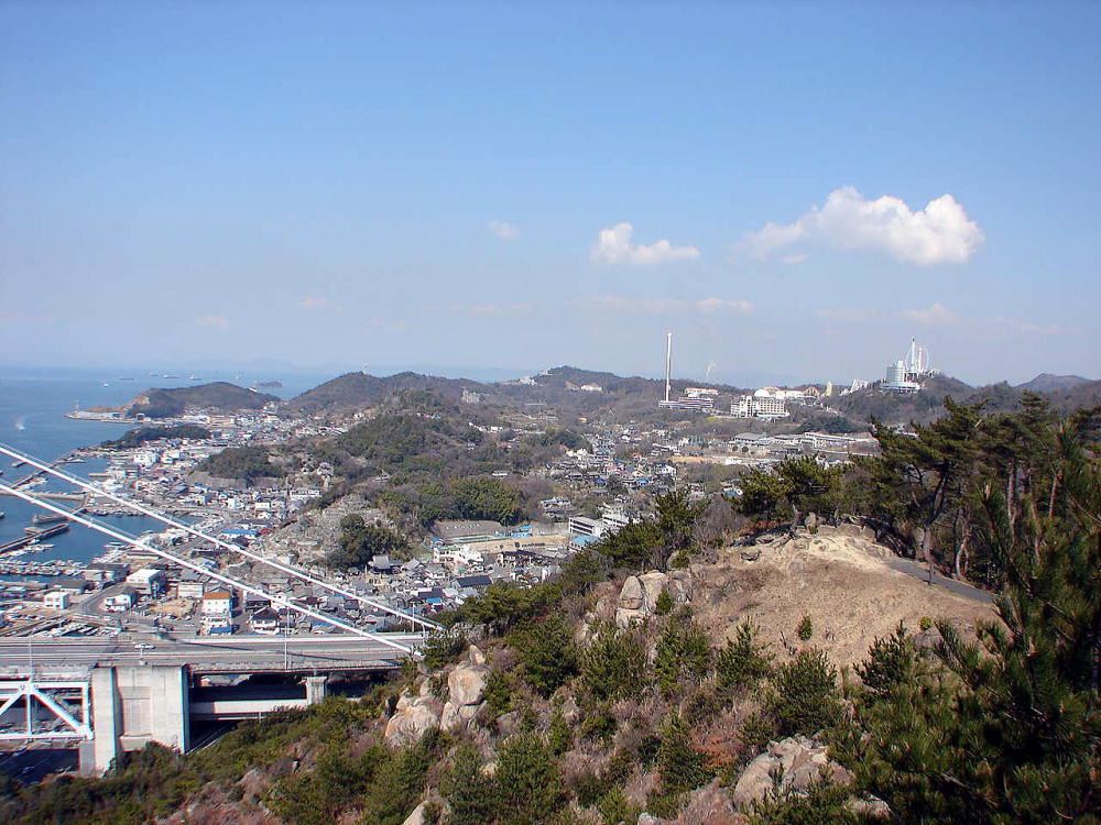 ![]() 鷲羽山山頂から望む下津井地区 下津井瀬戸大橋の前方左は、下津井町並み。町並みの右側、樹木が生い茂る所は下津井城跡、瀬戸大橋記念公園。さらにその右は鷲羽山ハイランド。 |