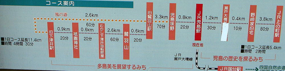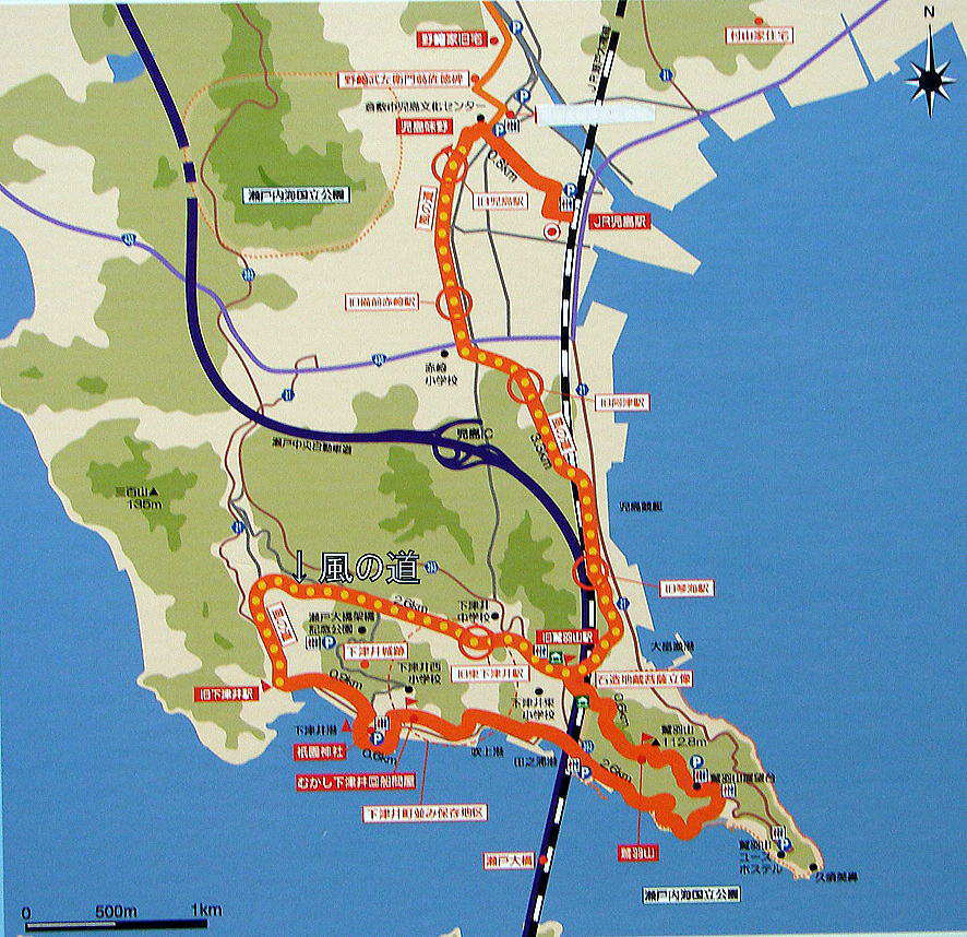 <風の道> 平成2年廃線となった下津井電鉄の軌道敷跡地を歩行者と自転車専用道として整備したもの。延長は約6Kmで周辺住民の方々が季節ごとの花を植え競艇場から下津井までは海の景色や野草、自生している木々などを楽しみながら歩く事が出来る。 ![]() ![]() |