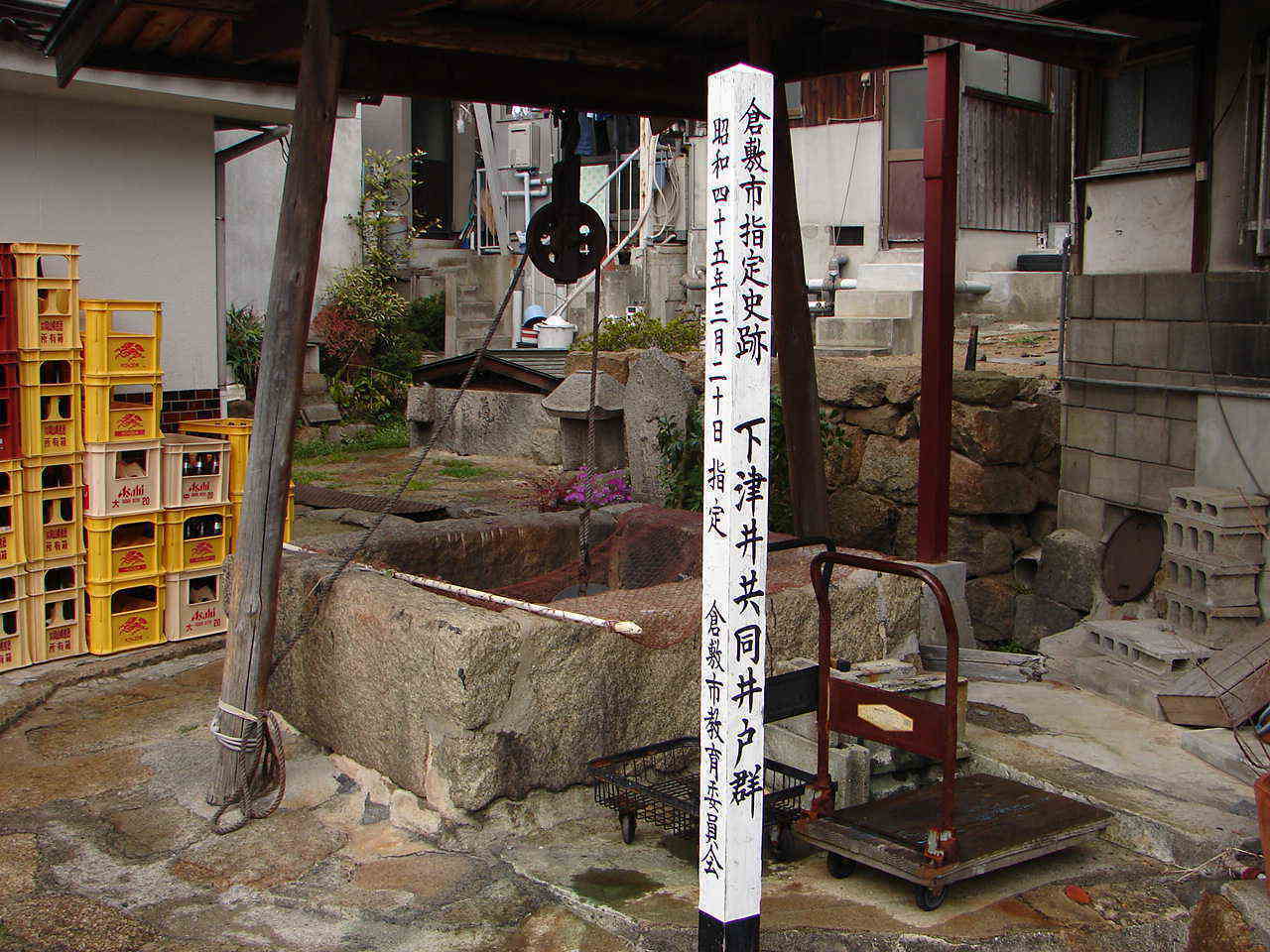 下津井共同井戸群の一つ「鶴井戸」〜奥後方の井戸は亀井戸。下津井の町並みにはいくつもの井戸が点在し、中には複数の家で使用する共同井戸も見られます。杓井戸・寺井戸・鶴井戸・亀井戸がそれです。 これらの共同井戸では井戸ごとに使う家がきまっており、その管理も使用する家々が厳しく行っていました。これらの井戸は江戸時代以降、下津井に暮らす人々の飲料水の供給源でした。また、港へ寄港する船に供給されたり酒造りにも使用されたりしました。 人々の生活を長い間にわたって支えてきたこの共同井戸群は、かつての下津井の繁栄を今に伝える記念碑ということができるでしょう。 ○倉敷市指定史跡 ○指定年月日 昭和45年3月20日 |