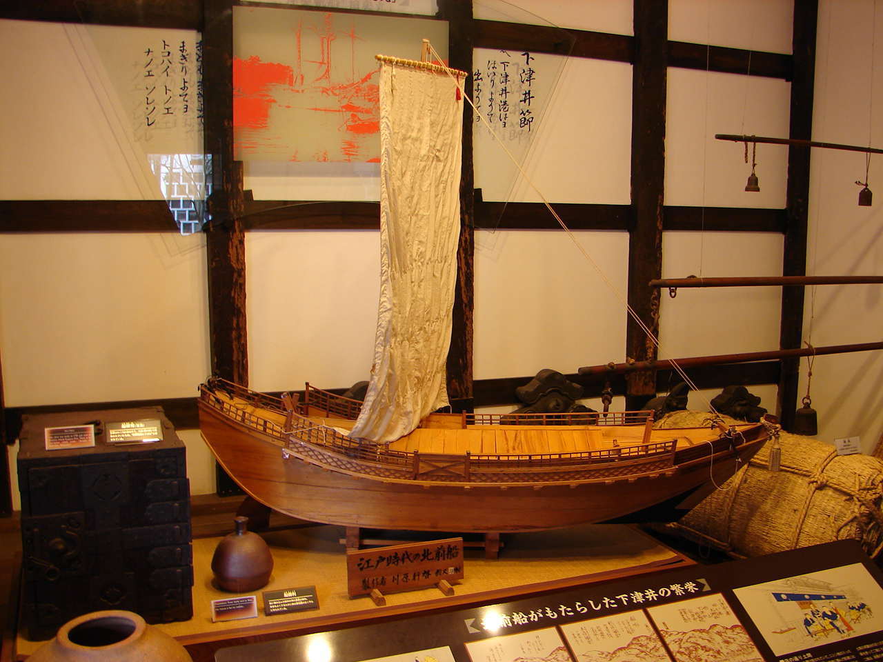 ![]() 「江戸時代の北前船」 母屋一階に展示している北前船の復元模型。母屋を通り抜けると右写真の広場となる。 |