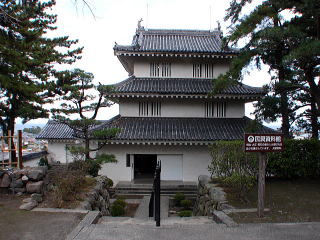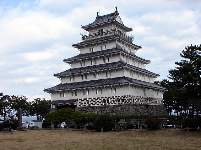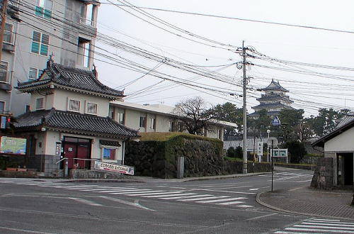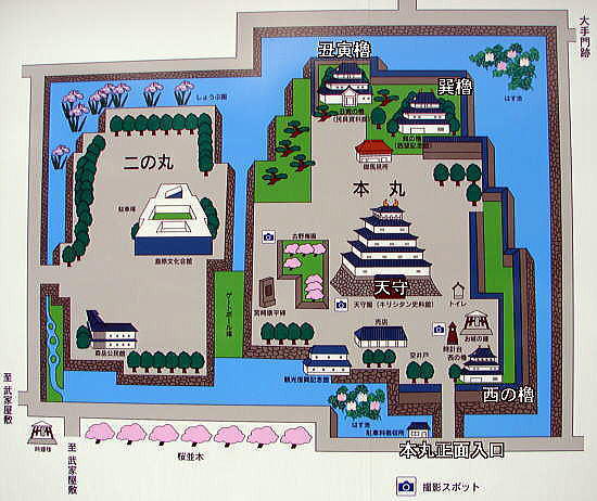 | 「再建建造物」 明治初期に城郭は廃城処分となり全て破却されたが、昭和35年以降、本丸に天守と3つの櫓、長塀が再建された。 最初に再建されたのは、1960年(昭和35年)に西三重櫓が再建され、その後、、1964年(昭和39年)に天守、1972年(昭和47年)に巽三重櫓、1980年(昭和55年)に丑寅三重櫓が再建。 |