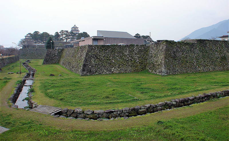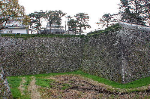 ![]() 北西側から見たニノ丸石垣と堀 後方は本丸となり、天守が見える。 |