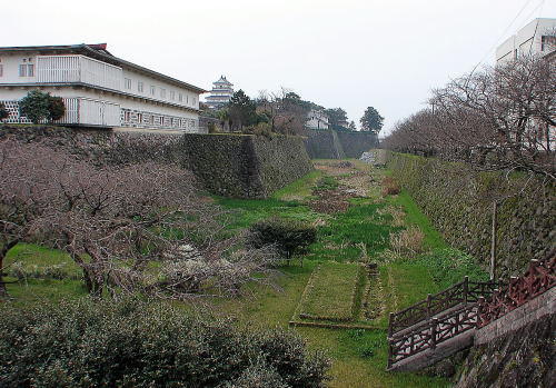 ![]() 本丸南側の水堀 屏風折れの高石垣をまじかにすると、島原の乱では一揆軍の猛攻に耐えた堅固な造りの城であったことが実感できる。 |