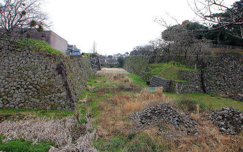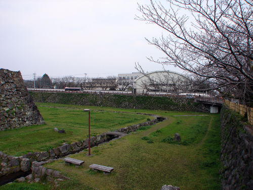 ![]() 二ノ丸堀跡から後方の三ノ丸を眺める 三ノ丸跡は市街化されており、小学校や高校が建っている。 |