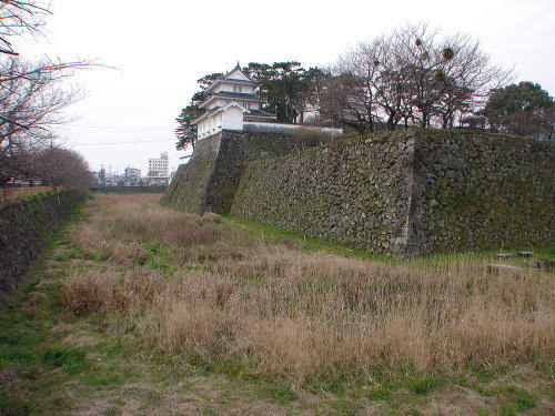 ![]() 本丸東側の石垣と堀 ニノ丸北東側から見た光景。櫓は丑寅三重櫓。現在、堀はこのような状態ですが、築城当時は水堀であった。 |