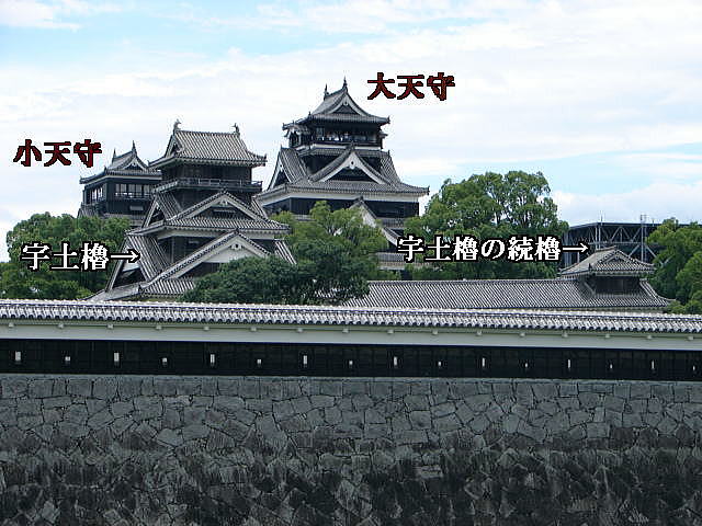 周囲5.3キロに及ぶ豪壮雄大な構えで、かっては大小天守を中心に櫓49、櫓門18、城門29を数えた。大小天守は明治10年(1877年)の西南戦争で焼失したものを昭和35年に再建したものでありますが、幸い焼失をまぬがれた宇土櫓他12の建造物はなお昔時のままで、国の重要文化財に指定され今日までその貴重な姿を残しています。その重要文化財は下記の建物群です。
