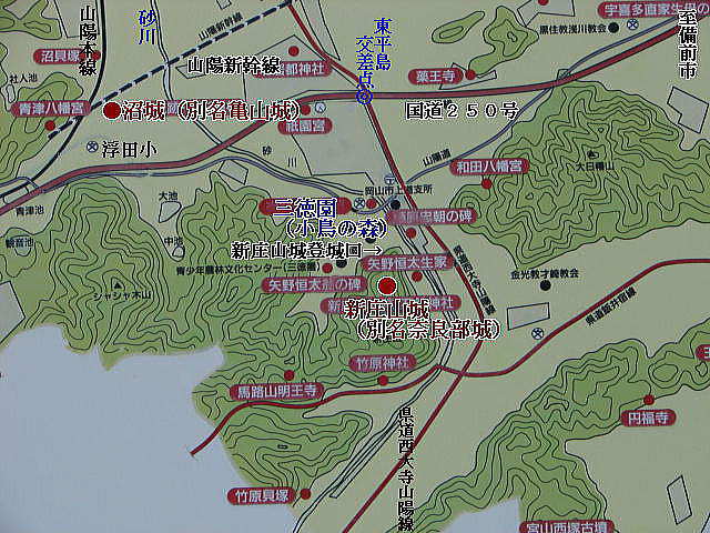 新庄山城周辺図![]() 新庄山城と沼城との直線距離は約2q。宇喜多直家は新庄山城に10年間居城し、その後、沼城に移る。 |