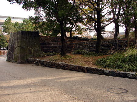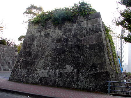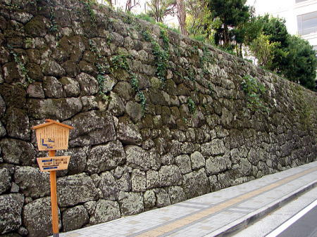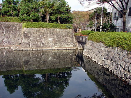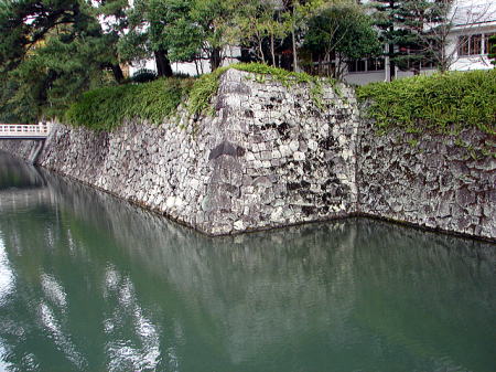 ![]() ▲駿府城三ノ丸堀西側の石垣 一番外側の三ノ丸堀は、現在東側(横内御門側)と南側(大手御門側)の一部が埋められている。 |