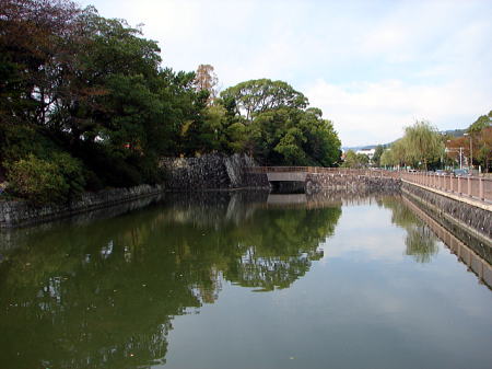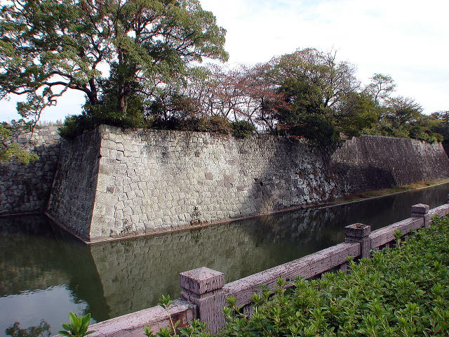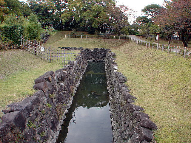 ニノ丸水路この水路は、本丸堀(写真手前)とニノ丸堀(写真後方)をつなぐ水路で本丸堀からの水を外へ流す目的で築かれている。 幅は約4.5m、江戸時代の深さは約4m、長さは約95mあり、4回折れ曲がっている。 本丸堀との接続部分は約2mの段差を設けて本丸堀の水位を保つようになっている。 また、水路両側は石垣で底の部分にも本丸側約50mにわたり石が敷かれており、底が洗い流されない非常にめずらしい構造である。 |