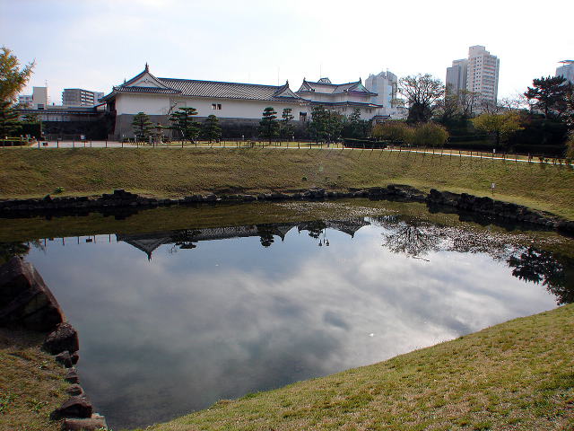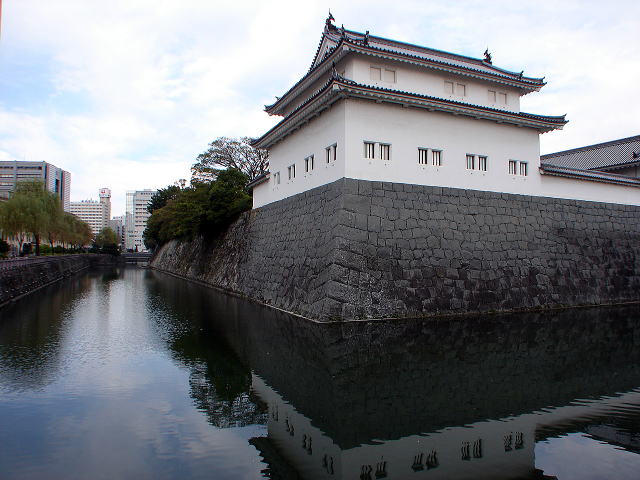 ニノ丸堀越しに見る巽櫓巽櫓は、ニノ丸南東の隅櫓で、城内で最も高く、L字型の構造をもっていた。平成元年の復元では、寛永15年(1638)の再建当時の姿を再現している。 |