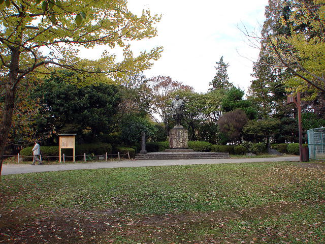 駿府城本丸跡本丸跡には、鷹を手にした徳川家康像が立つ。天守は寛永12年(1635)の火災で焼失後、再建されなかった。天守台は陸軍歩兵連隊により平地にされてしまった。 |