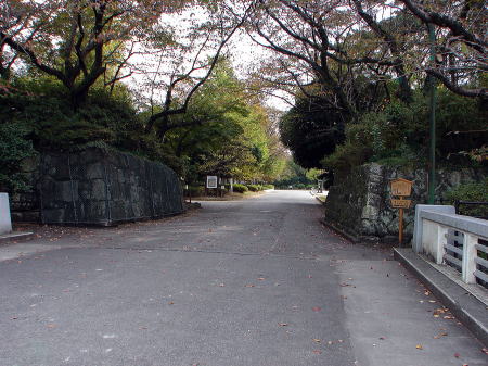 駿府城ニノ丸御門跡ニノ丸へ入る正面出入口。ニノ丸大手門とも呼ばれた。門は昭和32年に埋められ、約70m東側(静岡県庁側)に新たに出入口が設けられた(現在の駿府公園入口)。 この地点からニノ丸堀越しに石垣を見るとニノ丸御門の部分がふさがれた状況が確認できる。 |