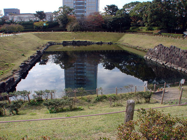二ノ丸水路本丸堀と二ノ丸堀を結ぶ水路は、4回折れ、二ノ丸堀(写真後方)に至る。 |