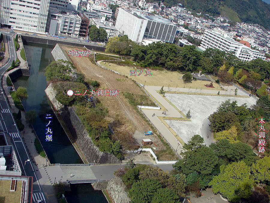 西(上)へ約70mほどの場所に橋があり、ニノ丸への正面入口であった。