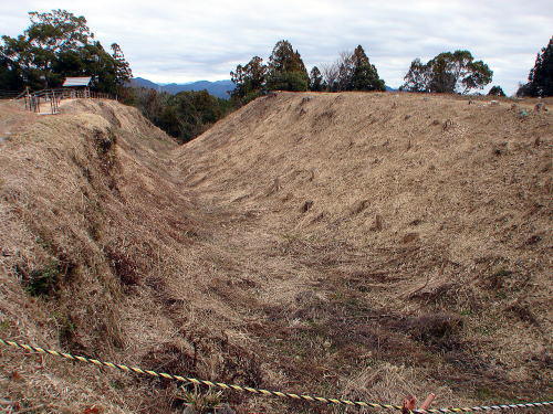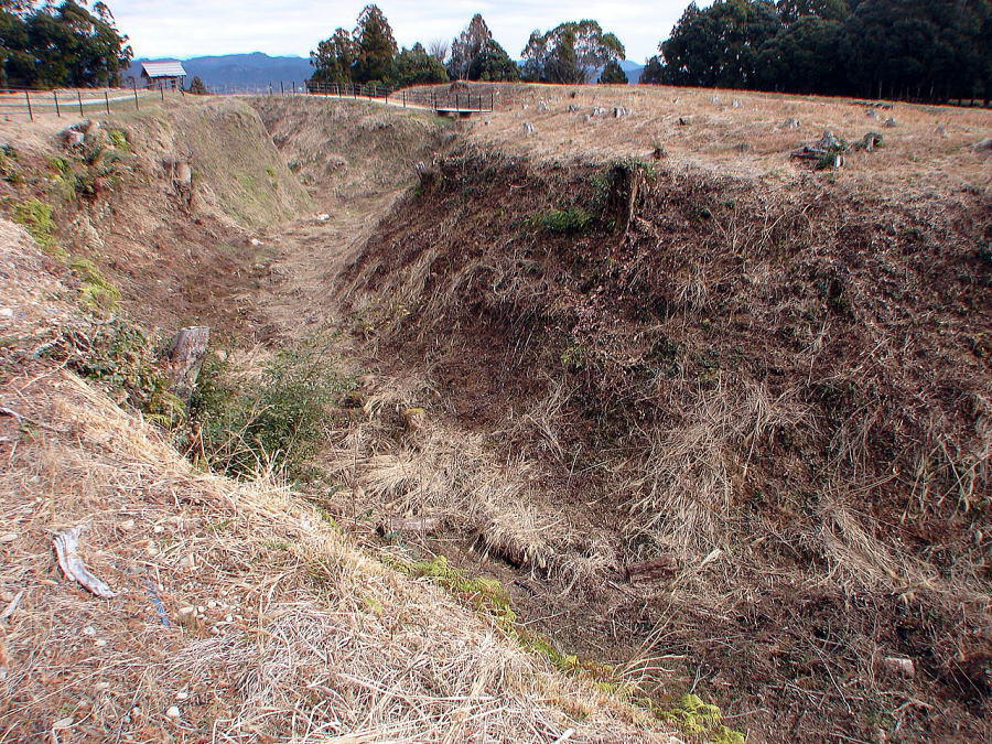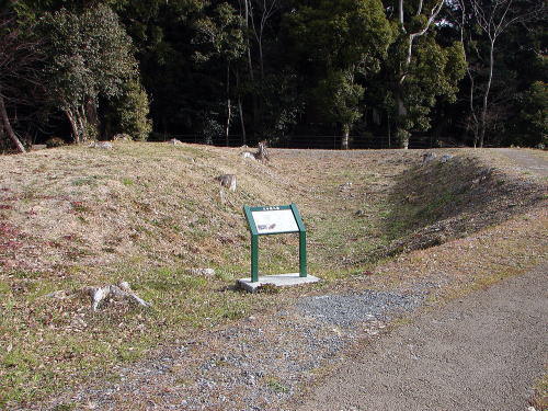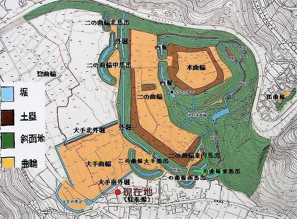 3大手曲輪![]() 大手曲輪は、大手北外堀と大手南外堀によってコの字型に囲まれ、古絵図では、西側前面に巨大な丸馬出と三日月堀が描かれている。この三日月堀の一部が、発掘調査で確認され、その存在が証明された。現在、大半は茶園とななり、全容を見ることは出来ない。 |