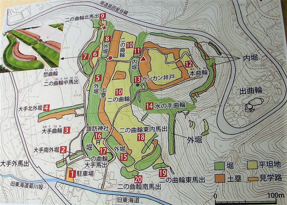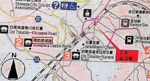 「所在地」 静岡県島田市菊川 ![]() (現地案内板より。一部追記) JR金谷駅から諏訪原城までは登り坂になるので、訪城(2020年1月)はタクシーを利用、帰りは徒歩で旧東海道金谷石畳を降って駅まで歩きました。ゆっくり歩いて約25分です。 観光案内所は金谷駅を出てすぐ右にあります。 |