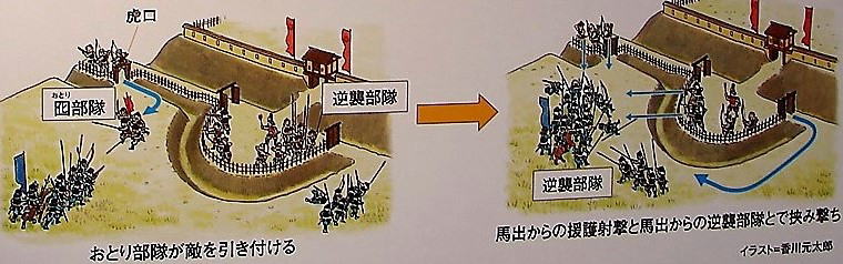 「丸馬出の戦い方」●馬出 虎口の外側に、防備強化と出撃拠点を目的に置かれた曲輪。 外側塁線が円弧状となる丸馬出と、方形になる角馬出に大きく分けられる。 |