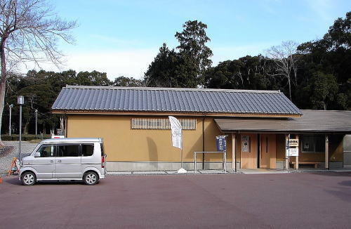 1駐車場・諏訪原城ビジターセンター![]() 建物は駐車場に建つビジターセンター(ガイダンス施設)。建物左側が城内への入口です。 |