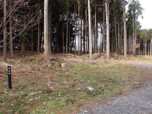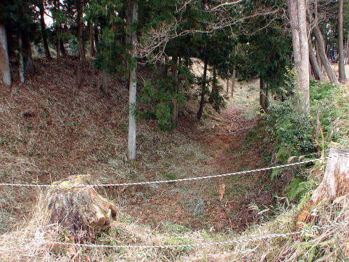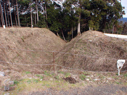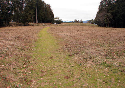 10二の曲輪中馬出から二の曲輪(左側)への通路![]() 平成22年度の調査で、通路が土橋ではなく、通路中央部が途切れ「木橋」となること、また、通路を左に渡ったところの虎口では、城門の礎石を確認。 |