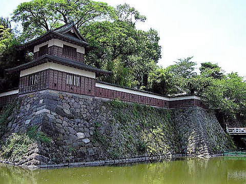 本丸北東に位置する復興された角櫓![]() 本丸の石垣や堀は旧状をよくとどめている。右は冠木橋と冠木門 |