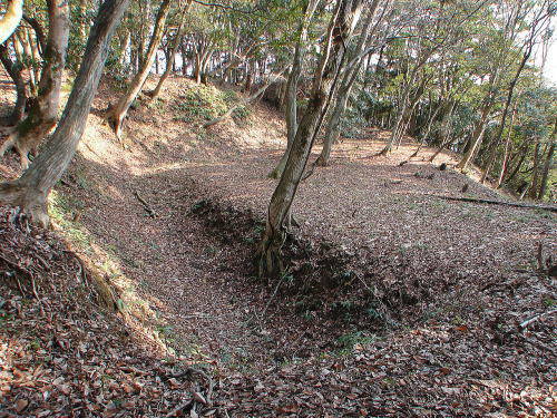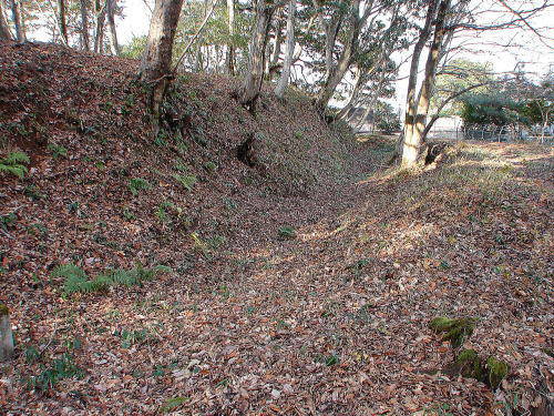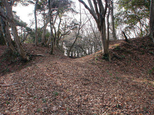 ![]() 土塁と空堀 搦手虎口の空堀。右の平坦地は馬場跡。 |