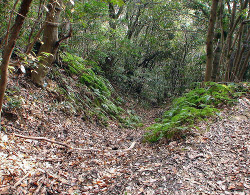 ![]() 上写真の空堀跡 奥が太閤ヶ平遺構図のⒷ地点となり、Ⓑ地点を右に曲がったところの空堀が右写真。 |