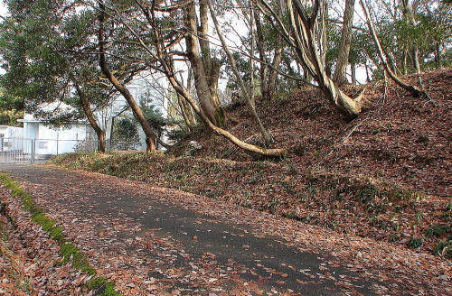 ![]() 高低差のある搦手虎口南側の土塁と空堀。土塁左は馬場跡 |