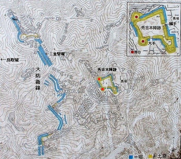 太閤ヶ平(秀吉本陣)および大防衛線(現地説明板に追記) 全国統一を目指す織田信長は、中国地方に勢力を持つ毛利氏と対立を深めて行き、天正8・9年(1580・81)の2度、羽柴(後の豊臣)秀吉を総大将として鳥取に侵攻し、毛利方の拠点であった鳥取城(久松山頂)を攻めました。この地に築かれた秀吉本陣は、高低差4m以上の土塁(土の堤防)と空堀に囲まれ、内寸58m、櫓台も設置した、大型かつ強固な防御性を備えた構造をしています。また、周囲のあらゆる尾根に陣城を配置し、鳥取城に対する強大な包囲網を敷いています。本陣および陣城群は、一城を攻めるにはあまりに大規模であることから、毛利氏との本格的な戦闘に備えた陣城であるとともに、信長を迎え入れるための本陣でもあった可能性が指摘されています。 ![]() ■標高263mの久松山の東側、標高251m本陣山山頂に築かれた本陣は、他の陣城と比べ圧倒的に大きなものでした。 ■正面にあたる大手口は南側にあり、郭内は西隅が一段高い構造となっています。 ■埋まっていますが、堀の深さや長さも今以上と推定されます。 ■本陣の西側(鳥取城側)の前線部分には、各陣城間の谷地形を二重・三重の堀でつないだ大防衛線が築かれています。(現地説明板より) |
