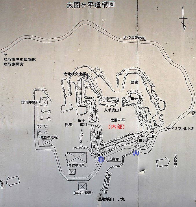 | <太閤ヶ平を歩く> 鳥取城跡&太閤ヶ平ルートマップ ![]() <各コース所要時間> 兵糧攻め対陣コース(鳥取城天守跡~太閤ヶ平)・・・1時間(約2.3km) 太閤ヶ平コース(太閤ヶ平~鳥取東照宮鳥居前・市立歴史博物館)・・・1時間30分(約3.5km) ※下山時は、地元の方のお勧めで展望もよく歩きやすいとのことで太閤ヶ平コース(アスファルト道)を歩きました。 (ルートマップは現地案内板に追記) |